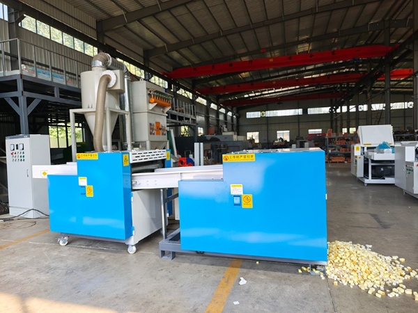 我厂生产hy-1000型海绵切粒机,本机型是针对海绵、乳胶棉专门设计生产的,本机采用多片式合金刀,该刀具硬度远远超过了旋转式扭刀的5倍,使用寿命是普通刀具的20